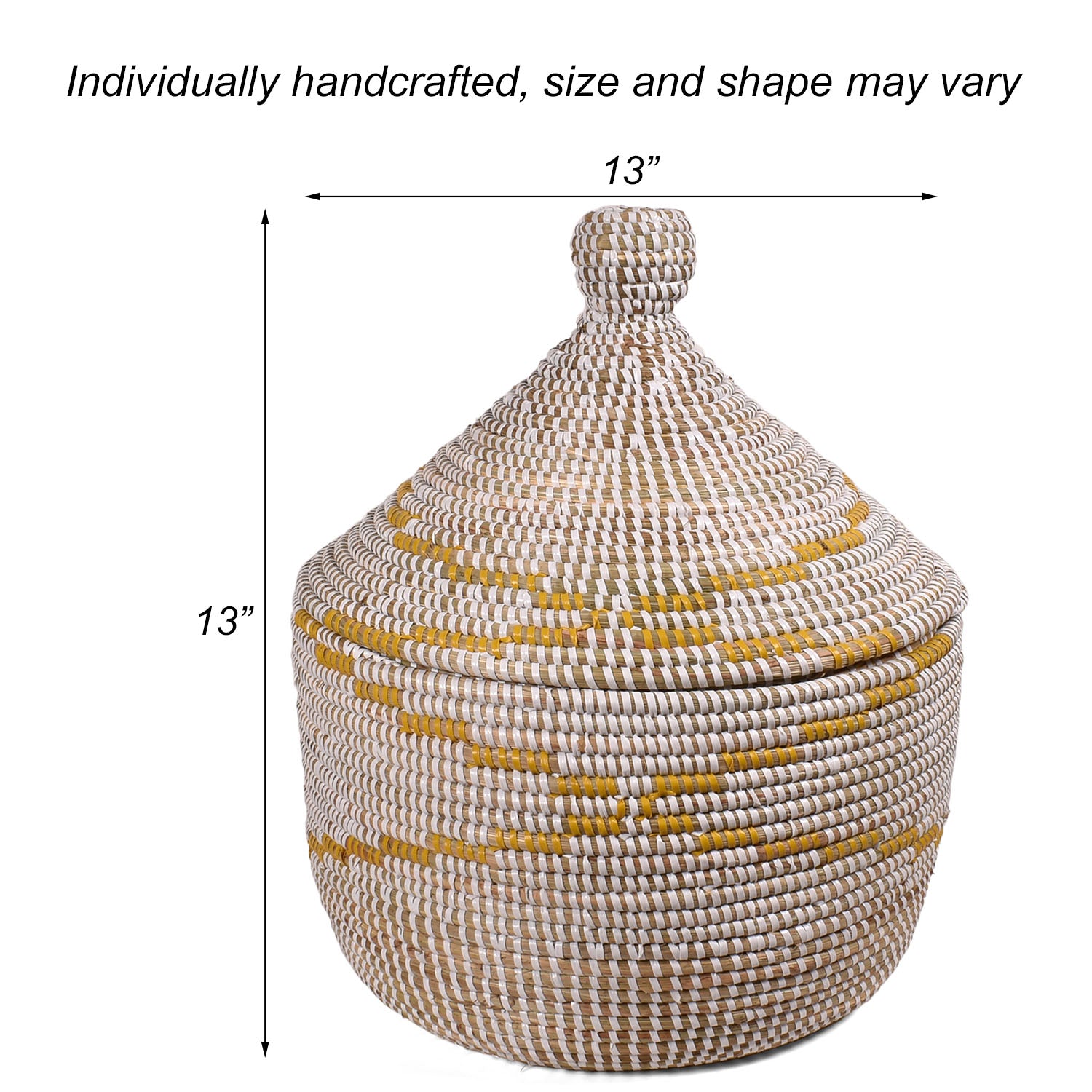 - Approximately 13 x 13 inches (DxH), 8 inches high without lid; sizes will vary and are not guaranteed