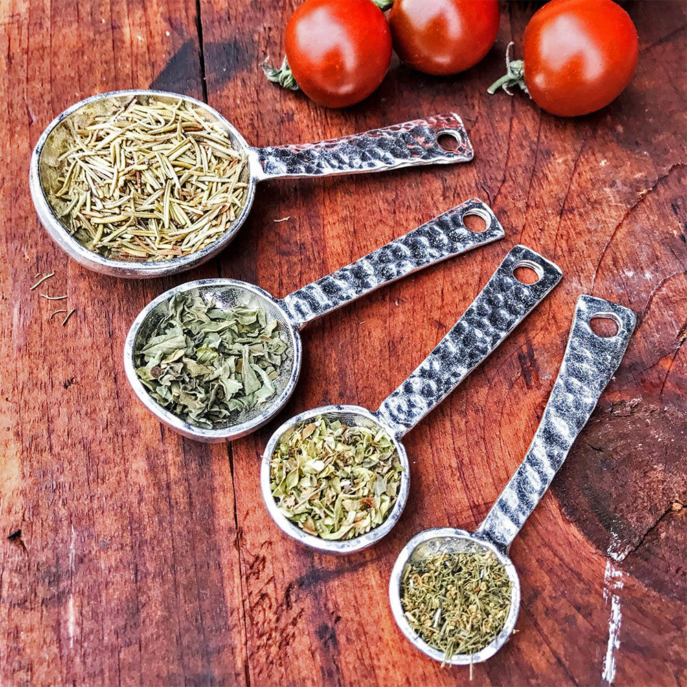 - Set includes 4 each measuring cups and spoons in standard sizes along with a hand-cast pewter display post