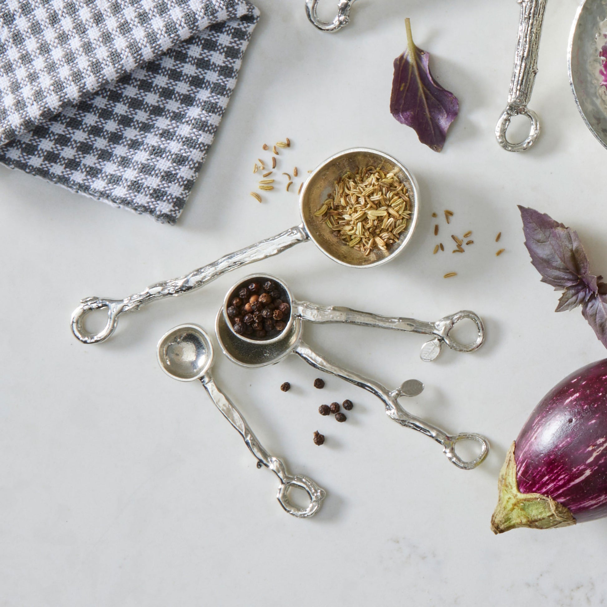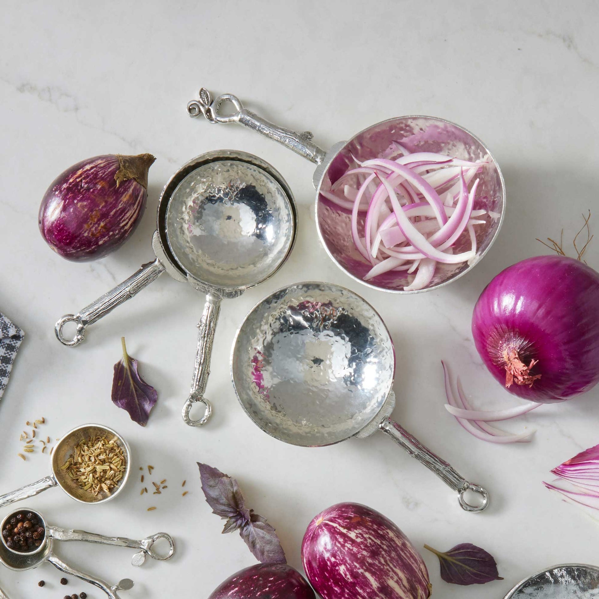 - Spoons and cups with hammered texture blend with both traditional and contemporary settings