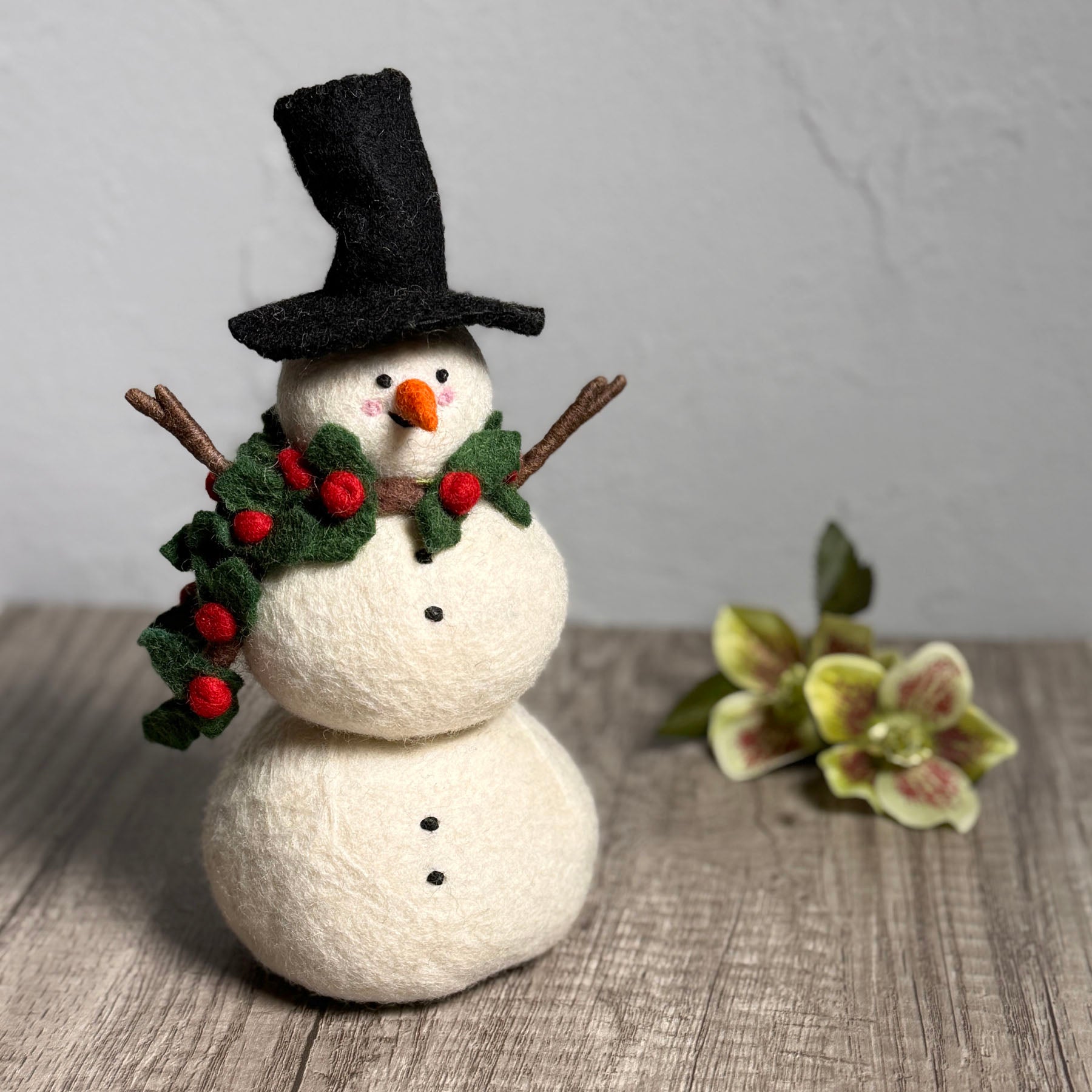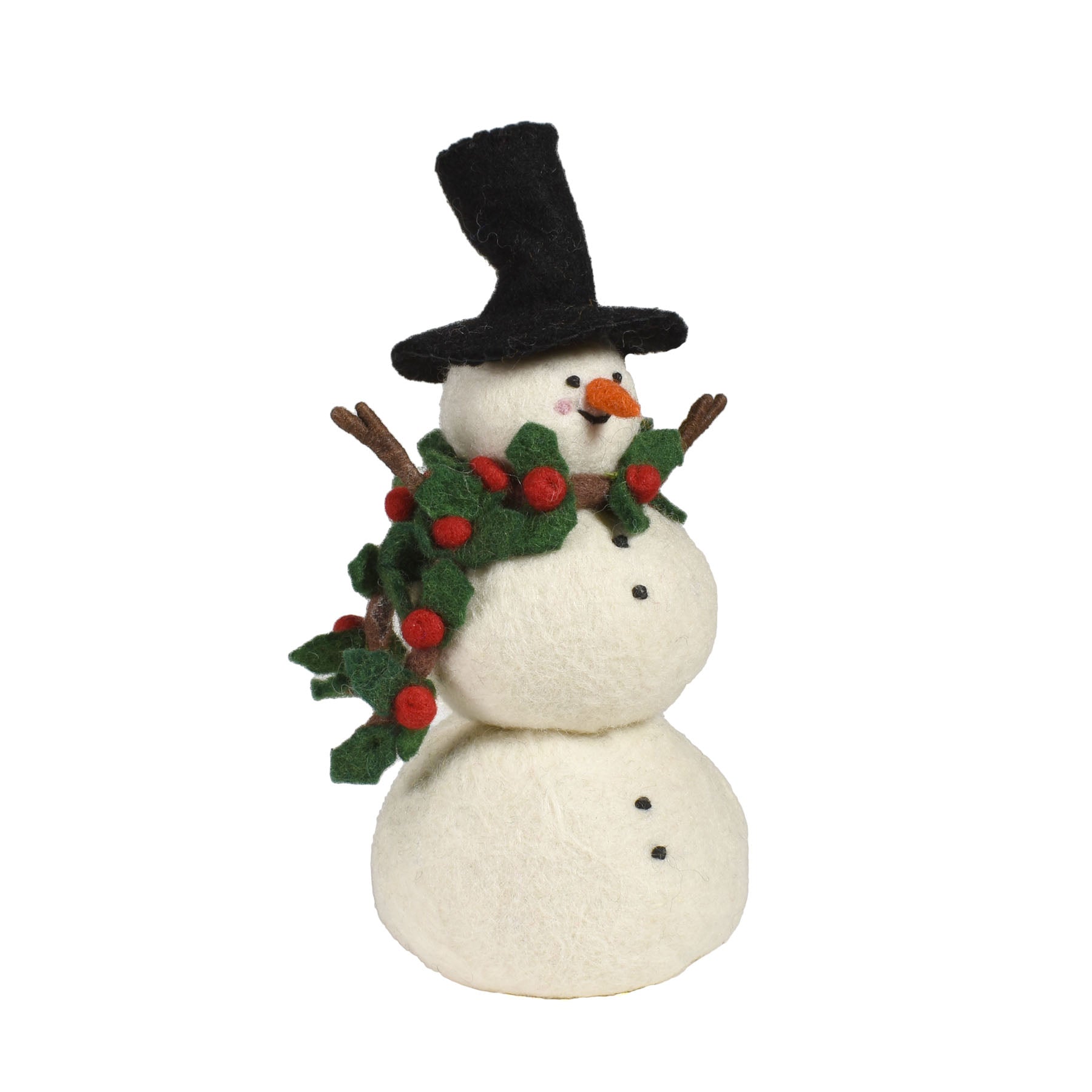 Fair Trade Felted Wool 9" Snowman with Holly Scarf Figurine, Handmade in Nepal