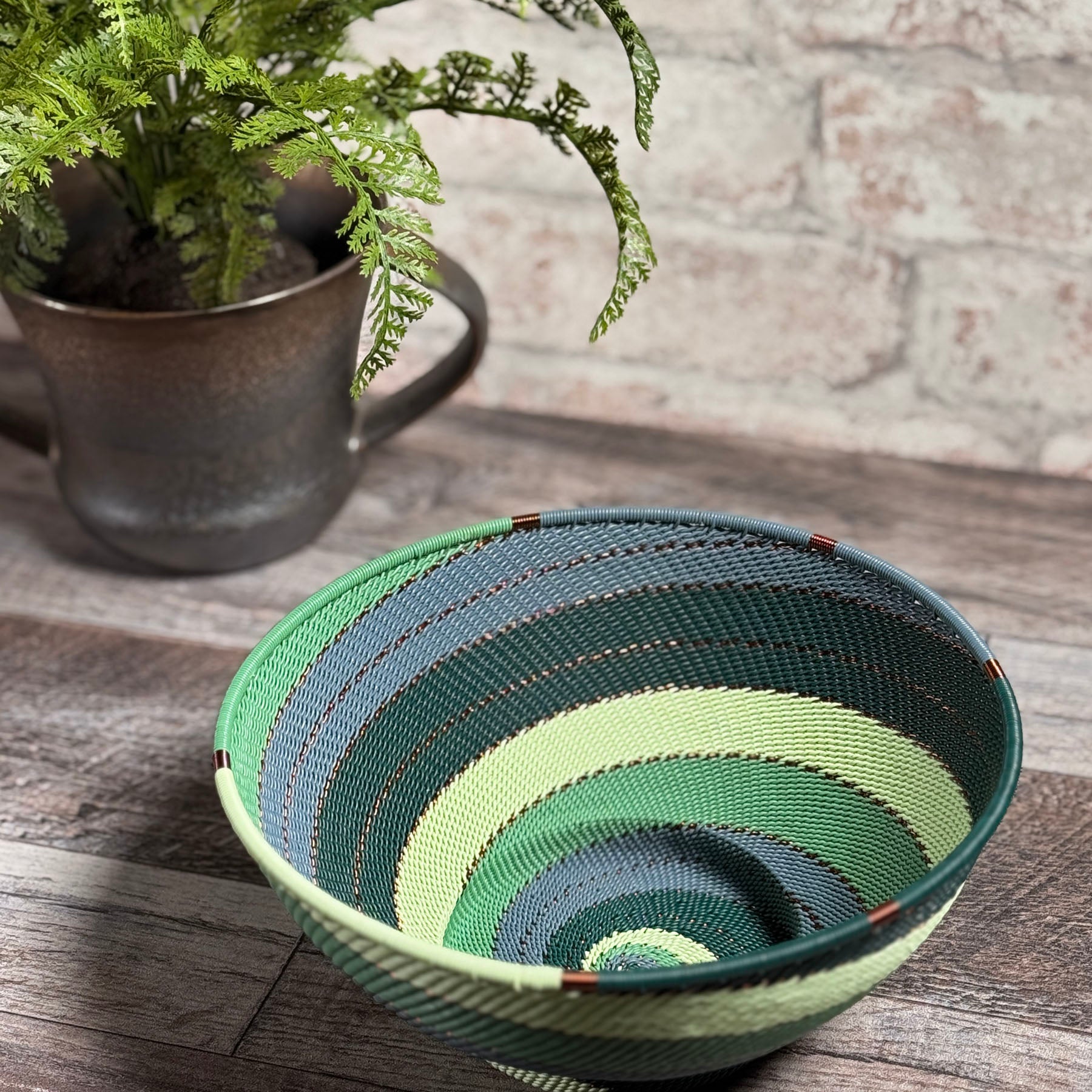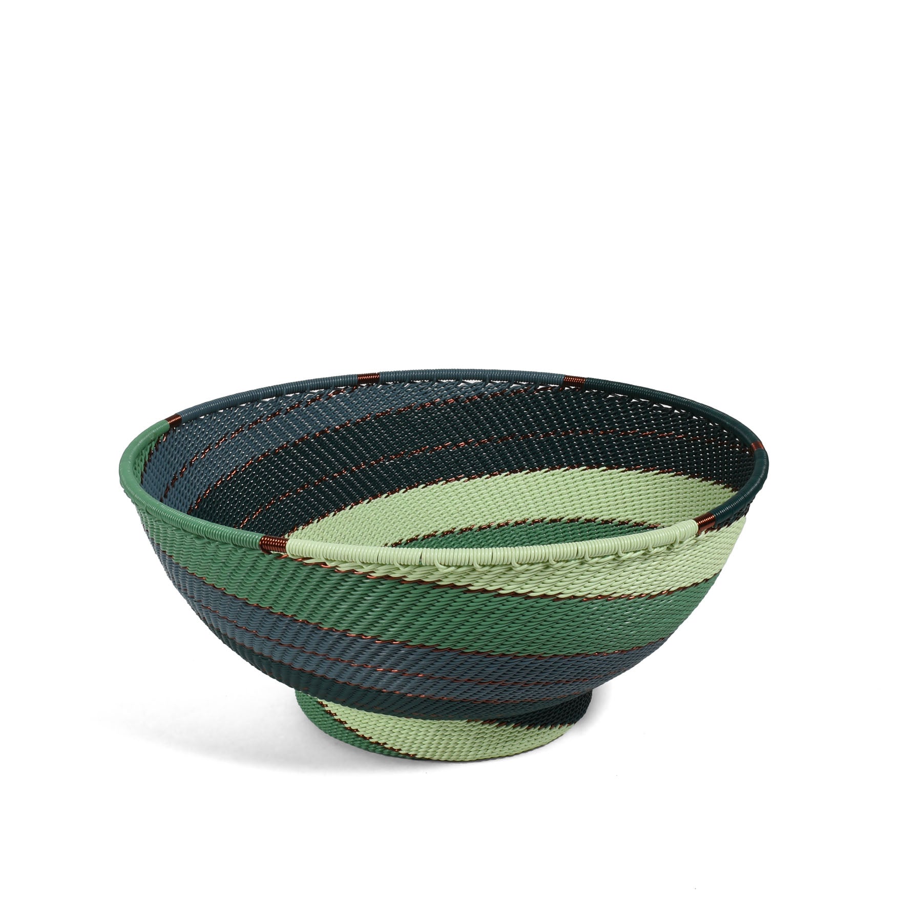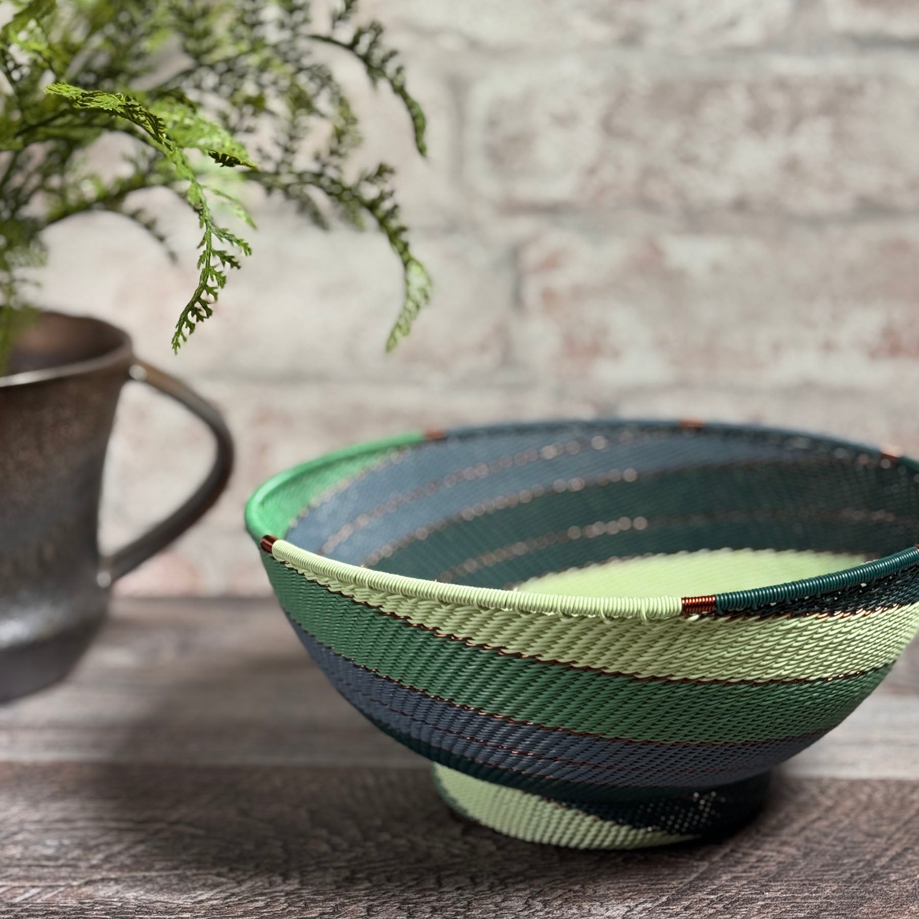 Fair Trade Zulu Telephone Wire 8" Pedestal Bowl, Emerald Swirl, Handwoven by African Makers, Each One Varies