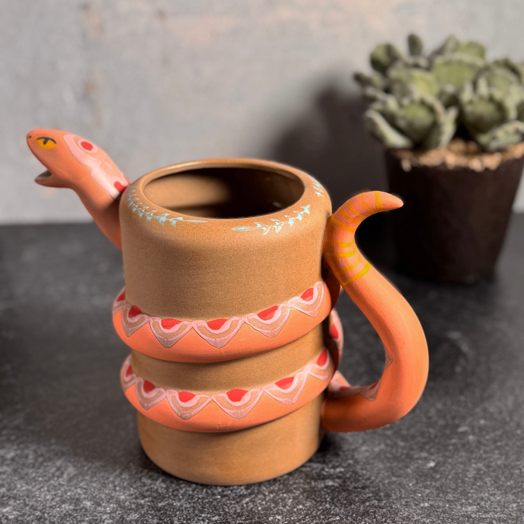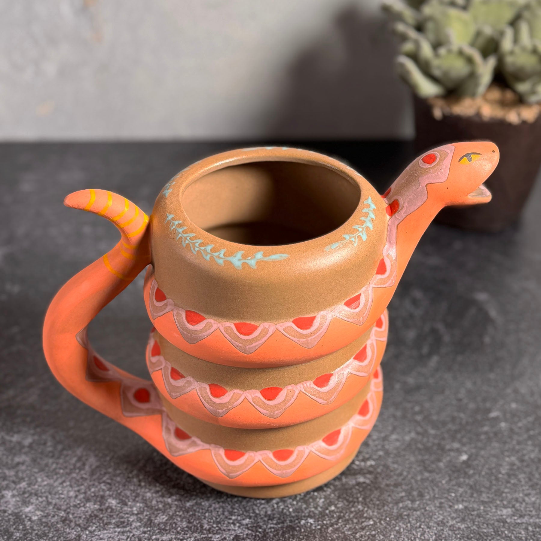 - A happy little snake is coiled around bisque clay, then hand-painted with colorful accents