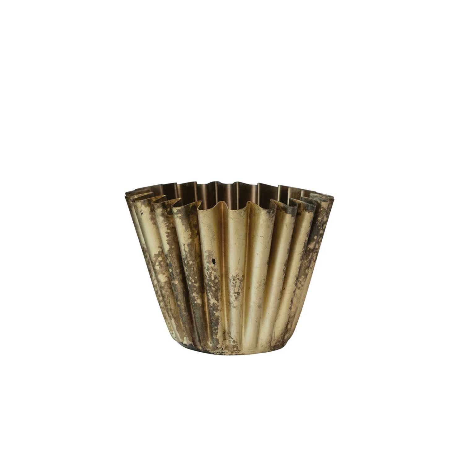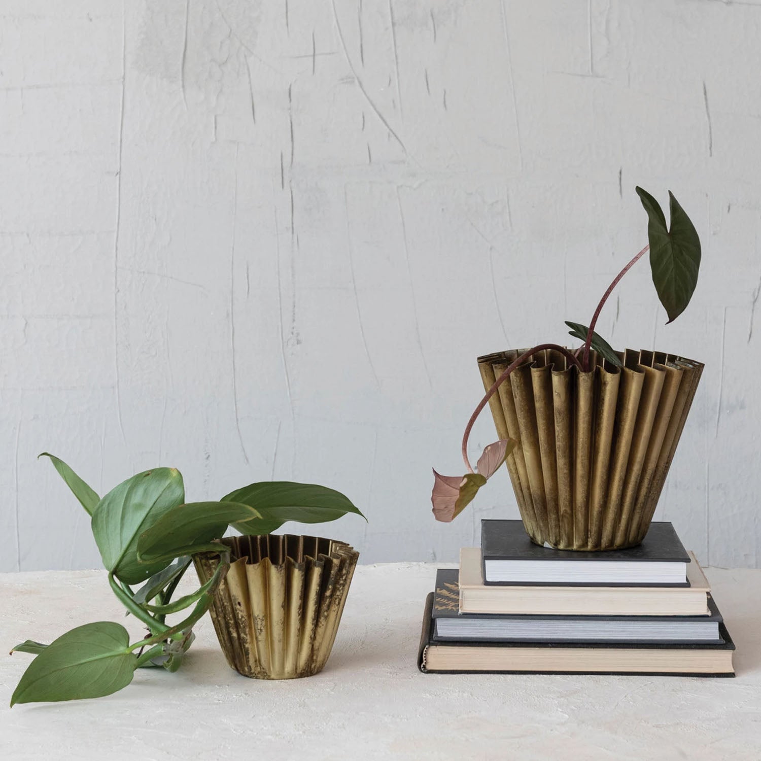- Pleated planter is made of metal with a distressed, antique brass patina