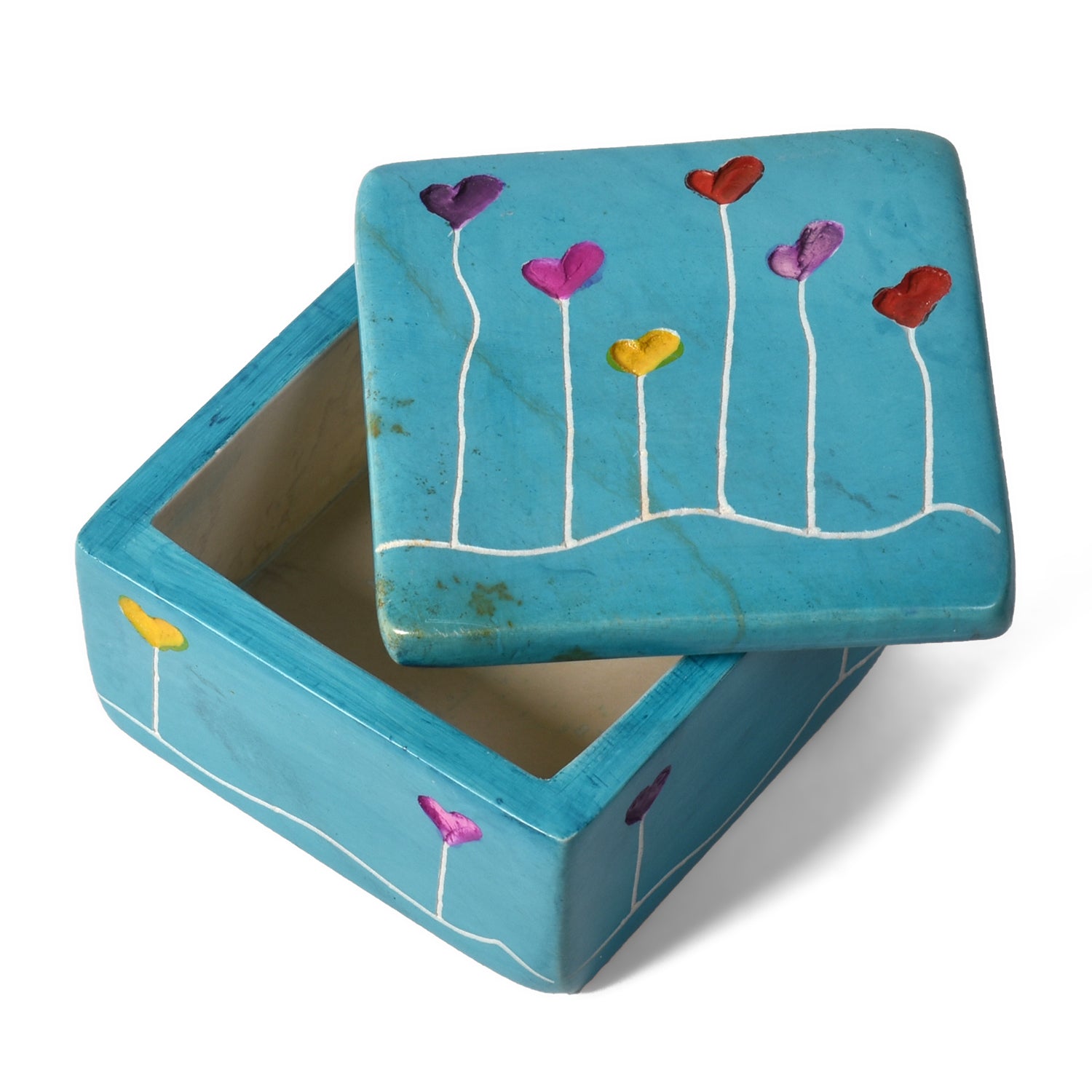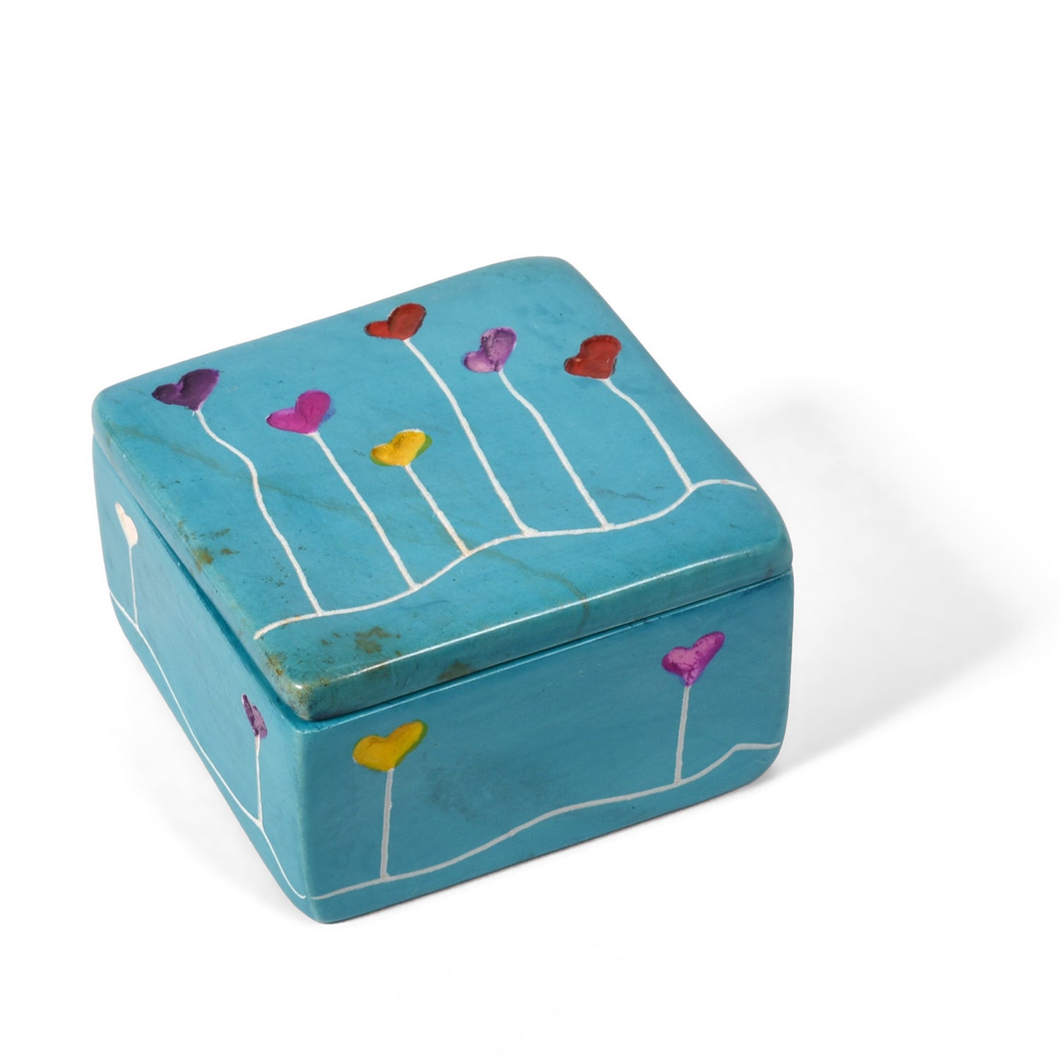 Kenyan artisans handcraft these charming keepsake boxes by carving soft soapstone and adding fanciful hand-painted heart flowers. The boxes are two inches square, perfect for holding a few pieces of small jewelry, loose change, or paperclips.