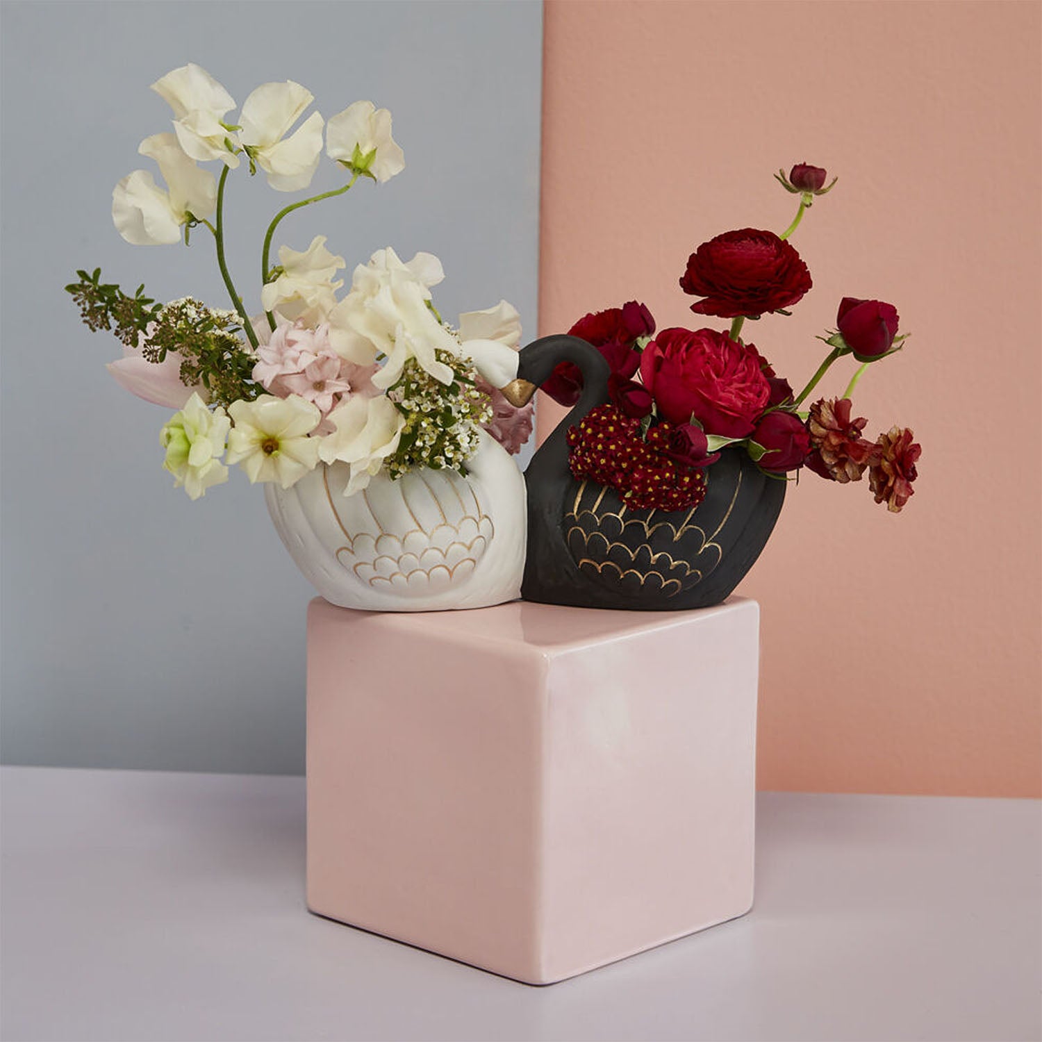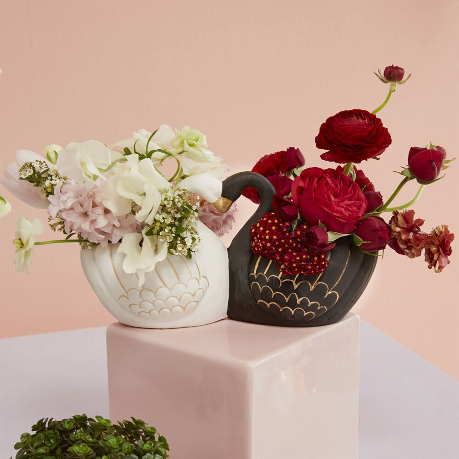 Elegant and sweet, these kissing swans are a charming accent on their own or when filled with beautiful blossoms. The ceramic planter is hand-painted in matte black and white with metallic gold accents. It's perfect for Valentine's Day, weddings and anniversaries, or anytime you want to express your love and affection.