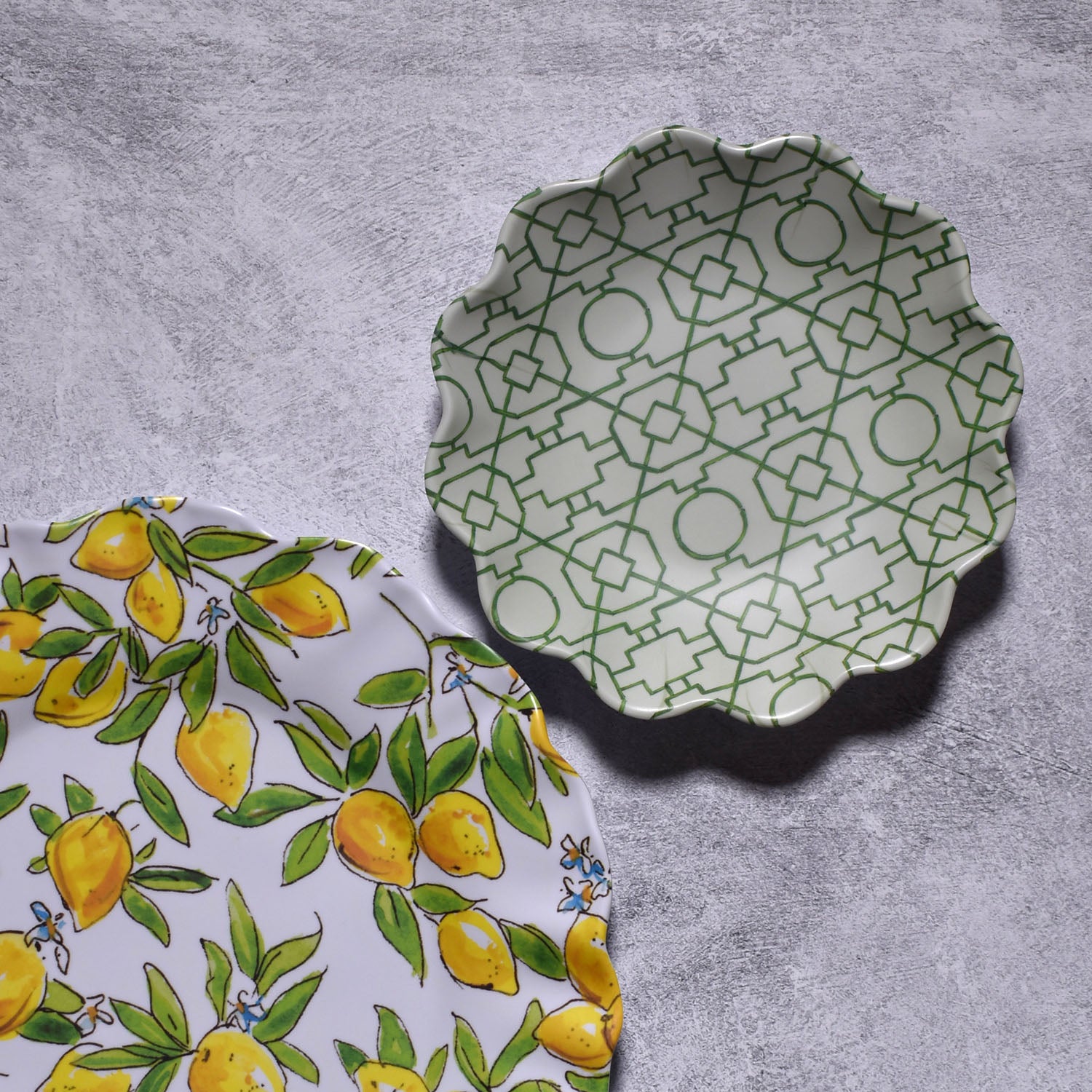 Merritt French Lemons 7-1/2" Melamine Salad Plates, Geometric Trellis Pattern with Scalloped Rim, Set of 6
