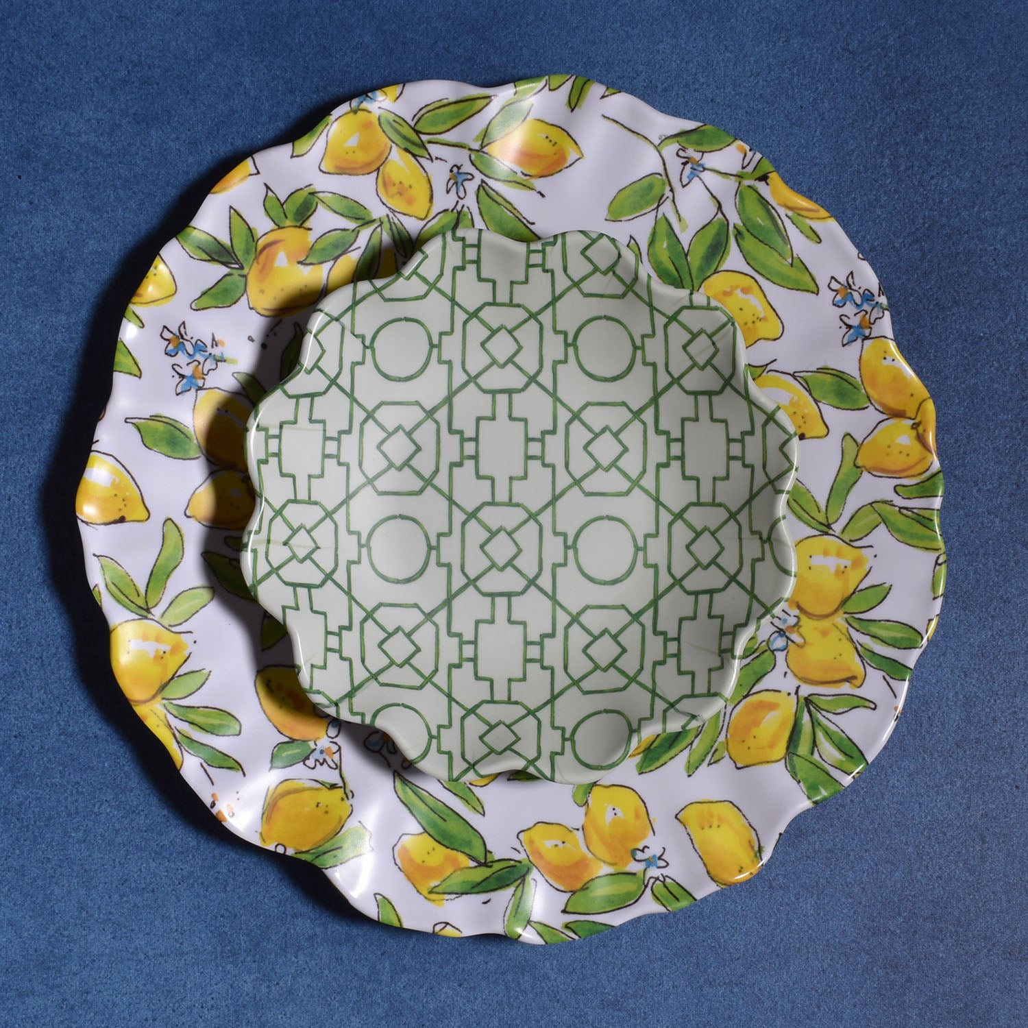 Create a bright and cheery tablescape with the French Lemons Collection from Merritt Designs. Made of sturdy luxe melamine with a smooth matte finish, the pieces feature artwork by Rosanne Beck in bright shades of yellow and green. The coordinated dinner and salad plates feature complementary patterns with lovely scalloped edges. For worry-free entertaining with uncompromising style, look no further than Merritt Designs.