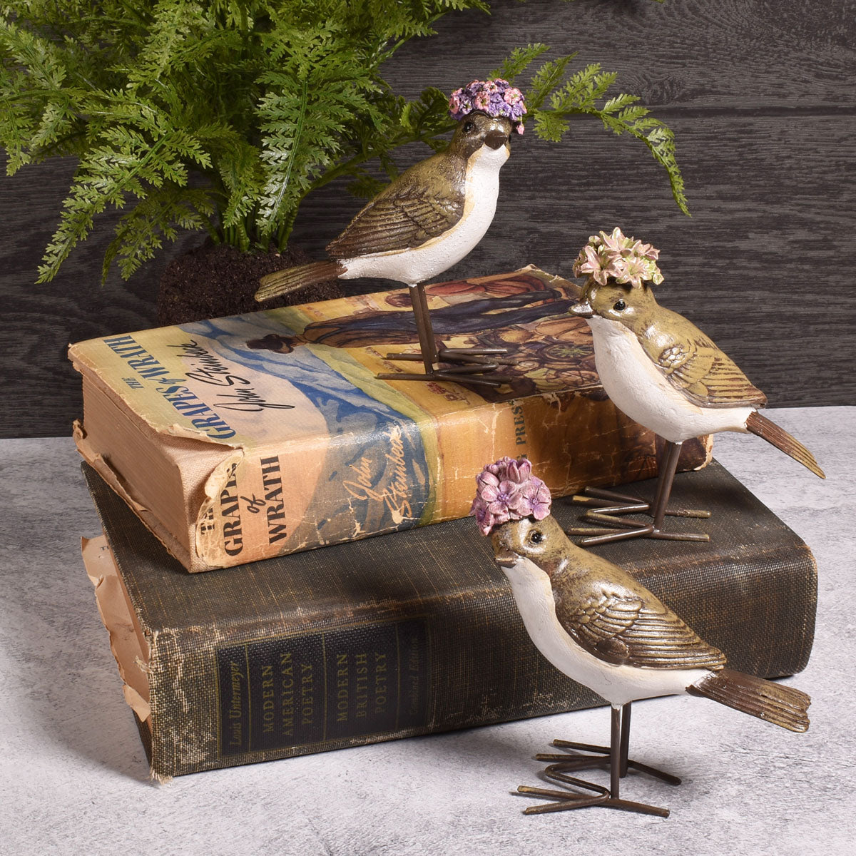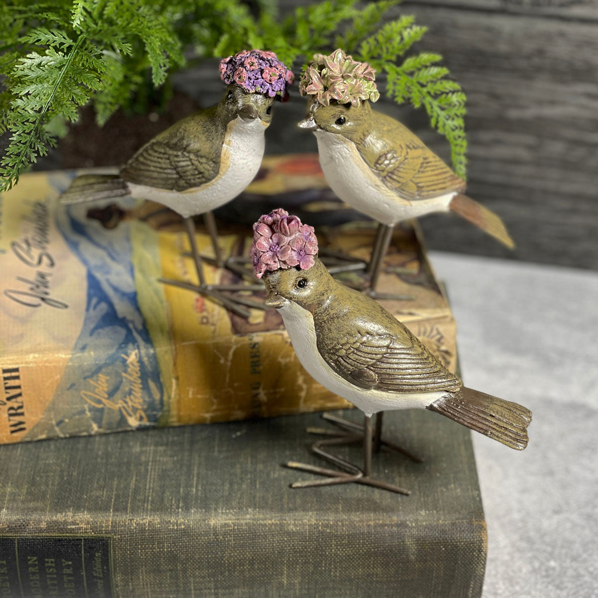 Carefully curated figurines can bring a room to life. These delightfully whimsical birds steal the show with their floral caps. They'll make a charming accent on a mantel or table, and you can let your creativity shine by grouping them with contrasting objects such as books or pottery.