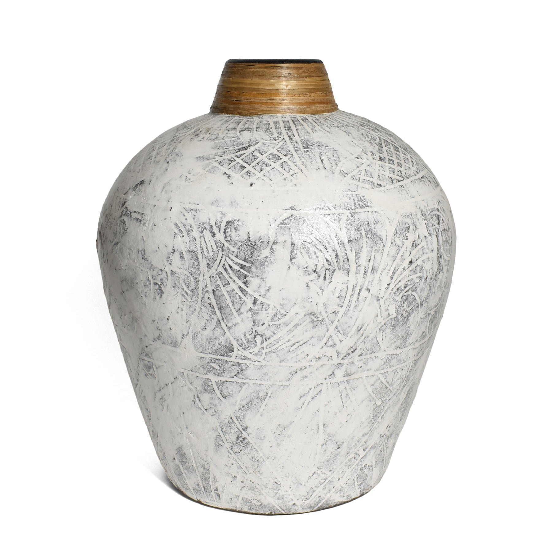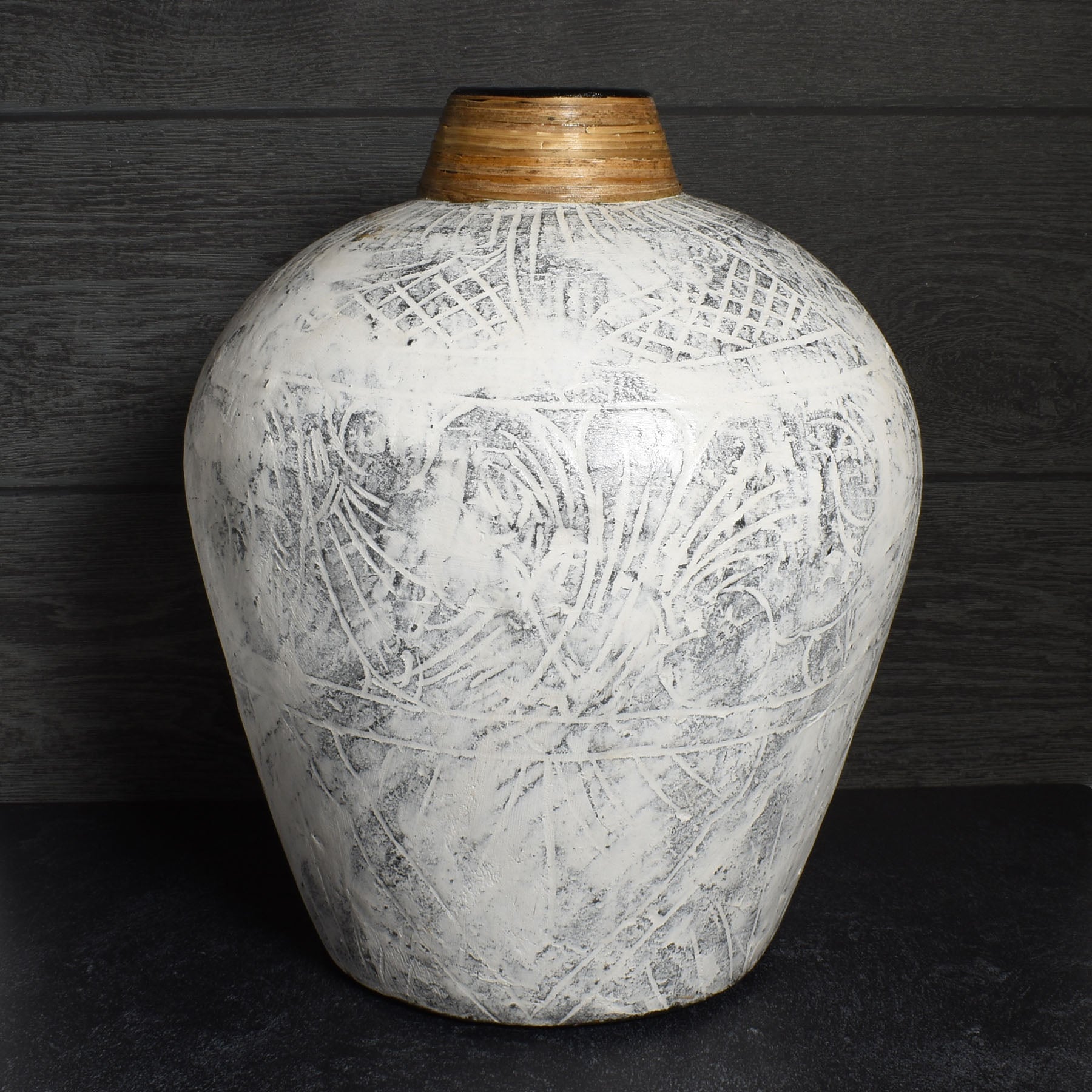 - Etched terracotta vase features a black base with a whitewashed overcoat, creating a primitive, rustic vibe