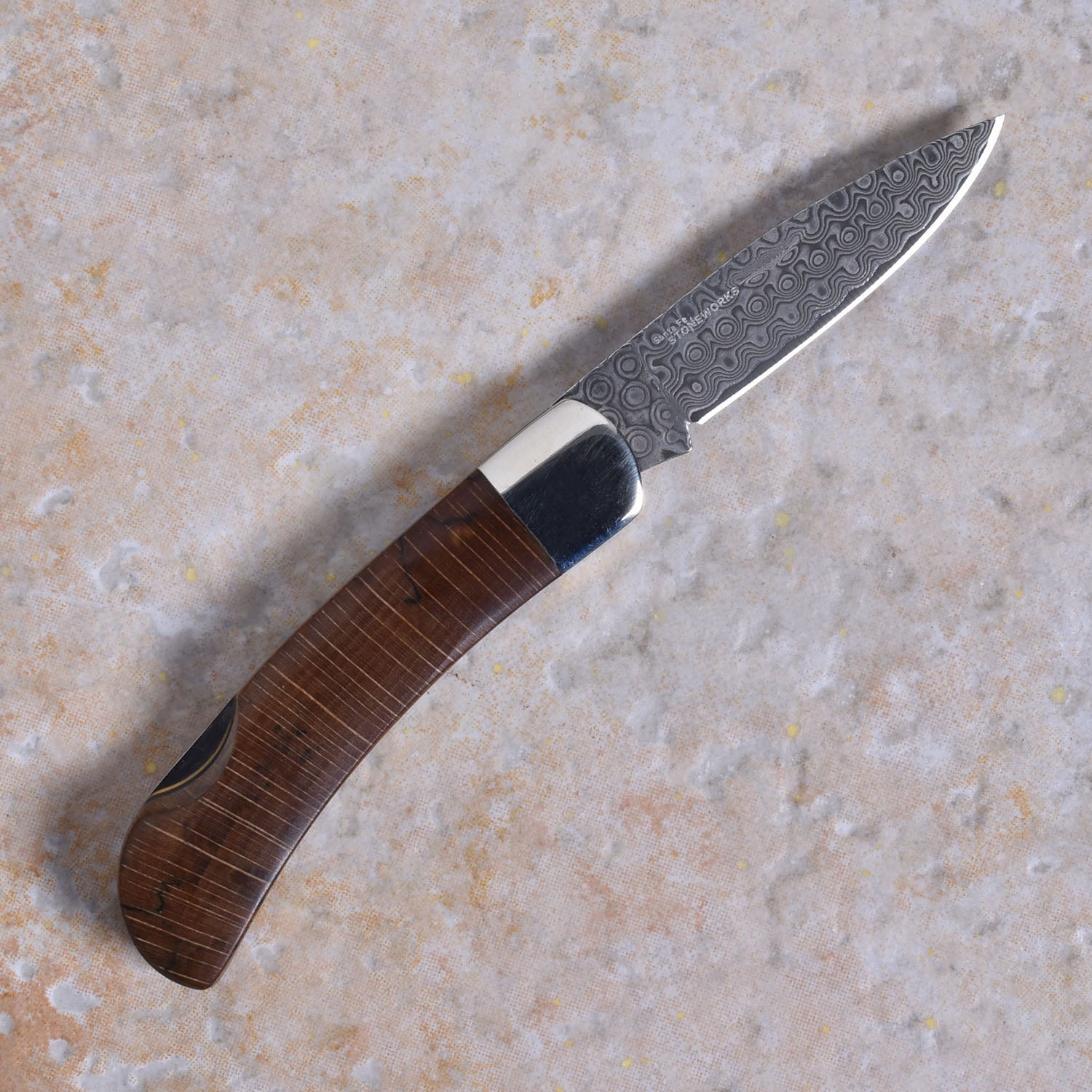 - Lockback mechanism with Damascus stainless-steel blade; solid wood back