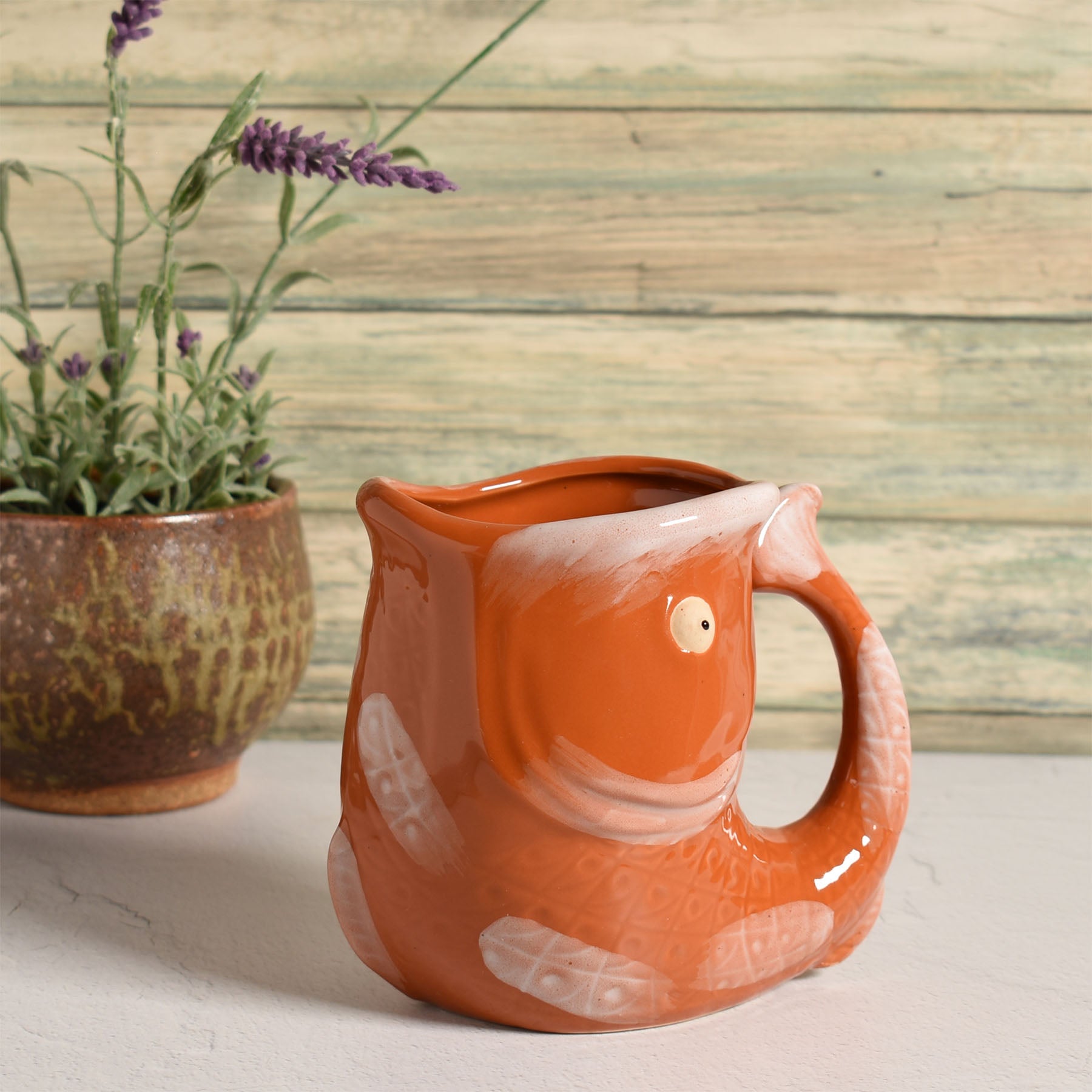 Add a splash of whimsy to your morning routine with this charming fish-shaped stoneware mug. Crafted with personality in mind, this delightful orange ceramic companion features hand-painted details that bring its aquatic character to life. The generously sized 14-fluid-ounce capacity ensures plenty of room for your favorite hot beverages, while the sturdy handle provides a comfortable grip. Measuring 5.25 x 3.5 x 4.5 inches, this versatile piece doubles as an eye-catching vase or unique planter. The mug is both microwave and dishwasher-safe, making it practical for everyday use.