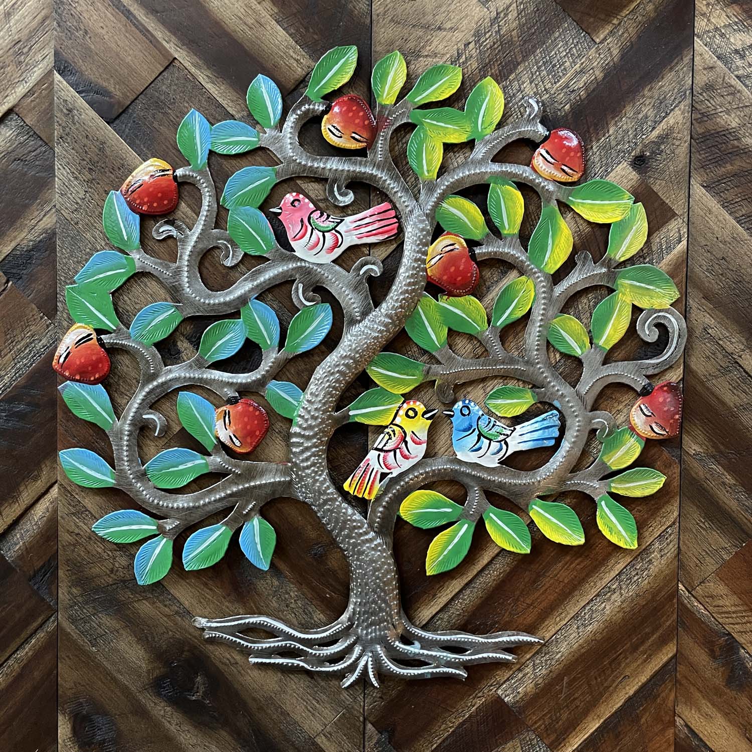 Tree of Life with Colorful Birds and Fruit 14" Steel Drum Wall Art, Fair Trade, Handmade in Haiti