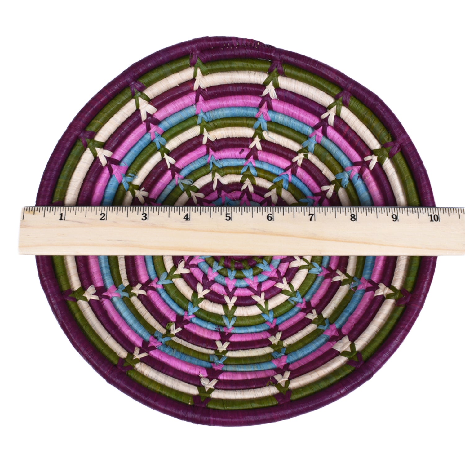 - Colorful round basket, handwoven in Uganda; approximately 10 x 2.5 inches (sizes will vary slightly)